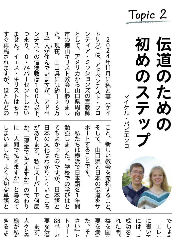 - Along with the articles and newsletters we write for AFM, we had the opportunity to write an article in Japanese for Adventist Life, the Japanese magazine published by the Japan Union Conference. Of course, the editors fixed all our grammar and other issues, but it’s neat to think that we officially have an article published in a language other than English! The theme was the importance of friendship evangelism.